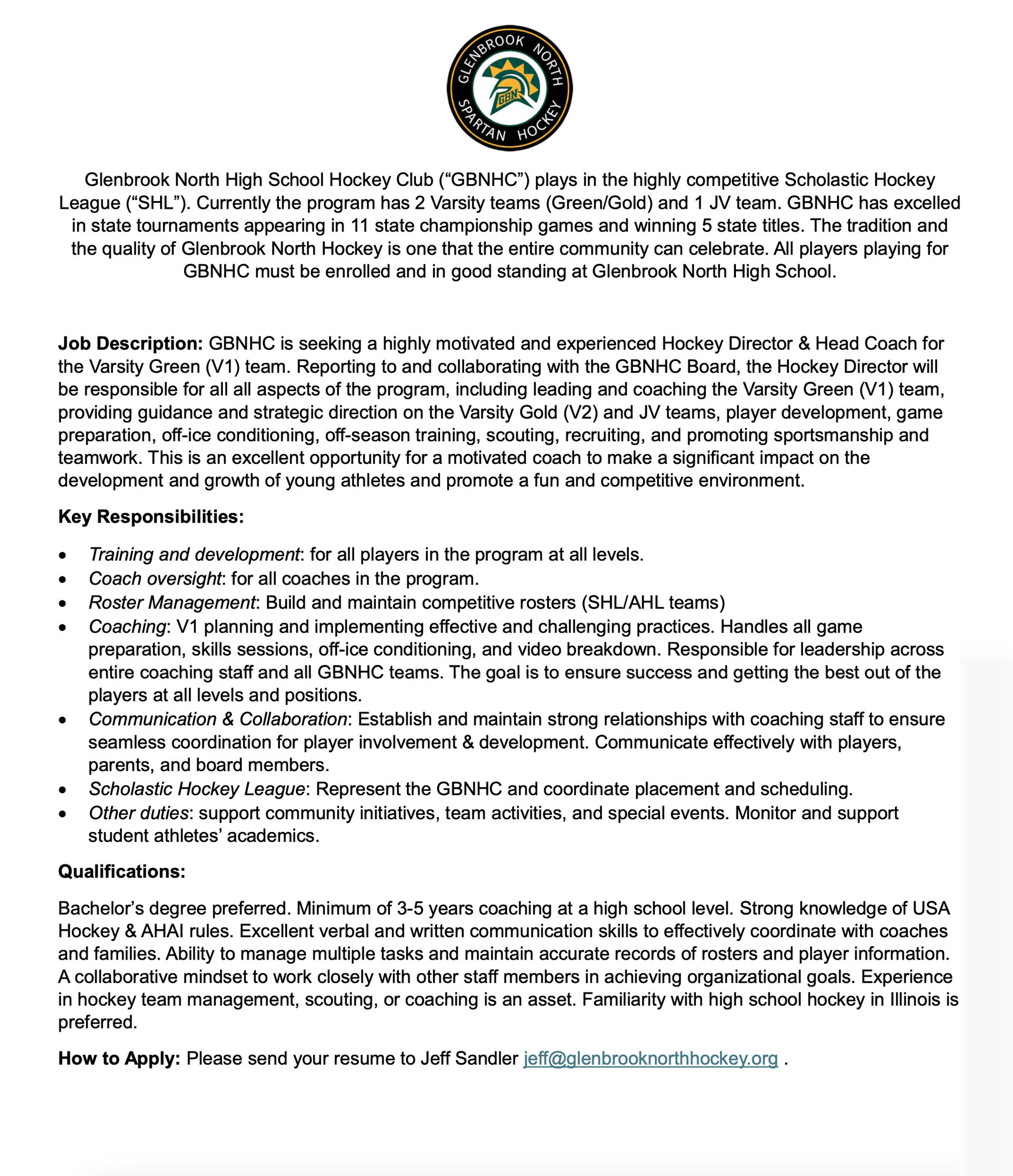 Interested applicants should submit a resume and cover letter to the GBNHC Board, via Jeff Sandler at jeff@glenbrooknorthhockey.org by December 16, 2024.